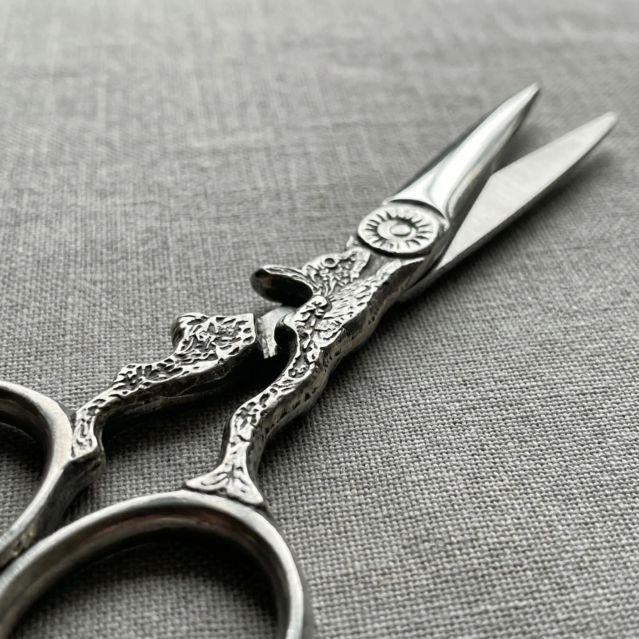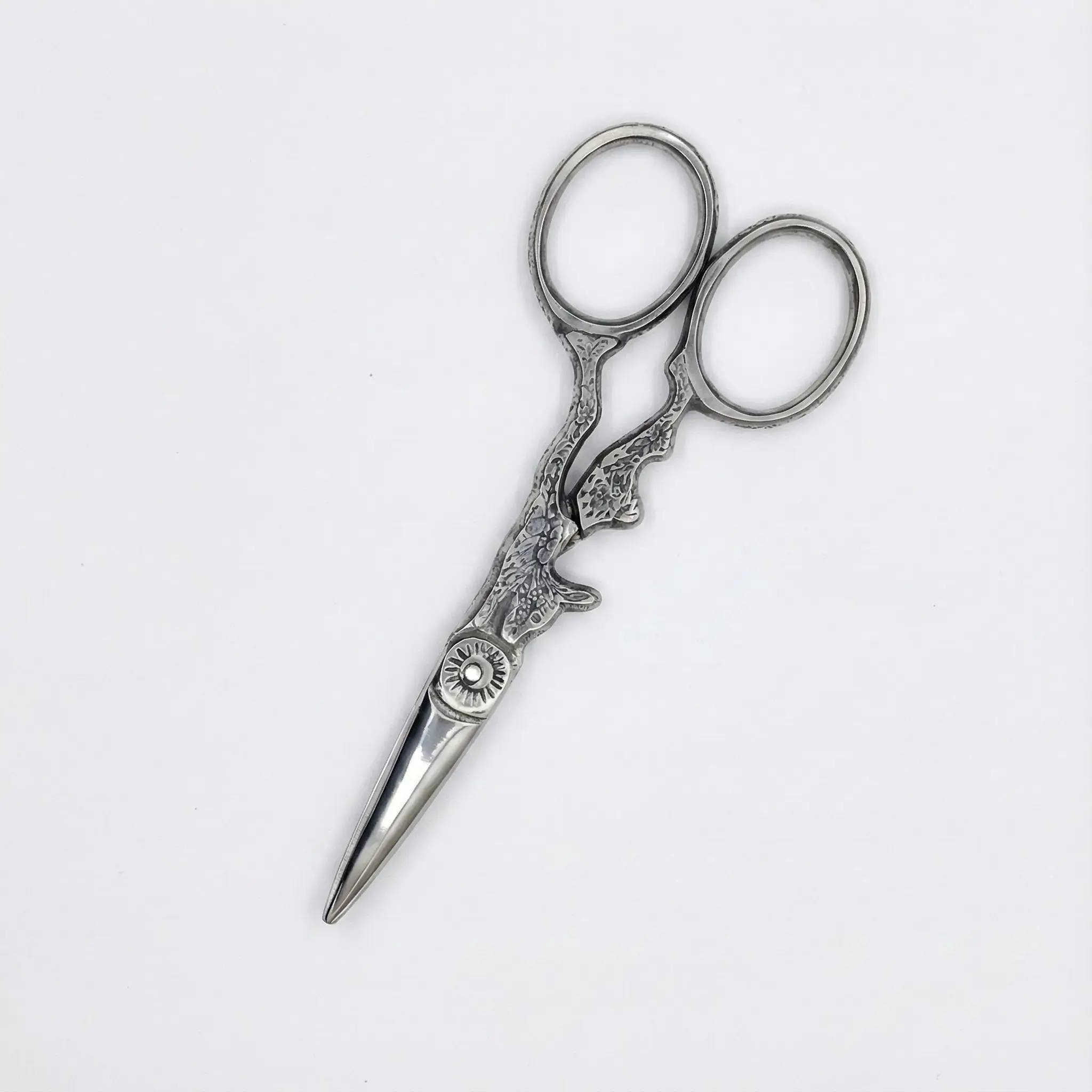 Unlike standard models, this scissor features a highly detailed, sculpted handle depicting a hare/rabbit integrated into the shank. The finish is a specialized Antique/Dark Satin, providing a sophisticated, textured look that resists fingerprints and glare. It features a decorative “Sunburst” pivot screw, adding an extra layer of fine detail that sets it apart from generic competitors.